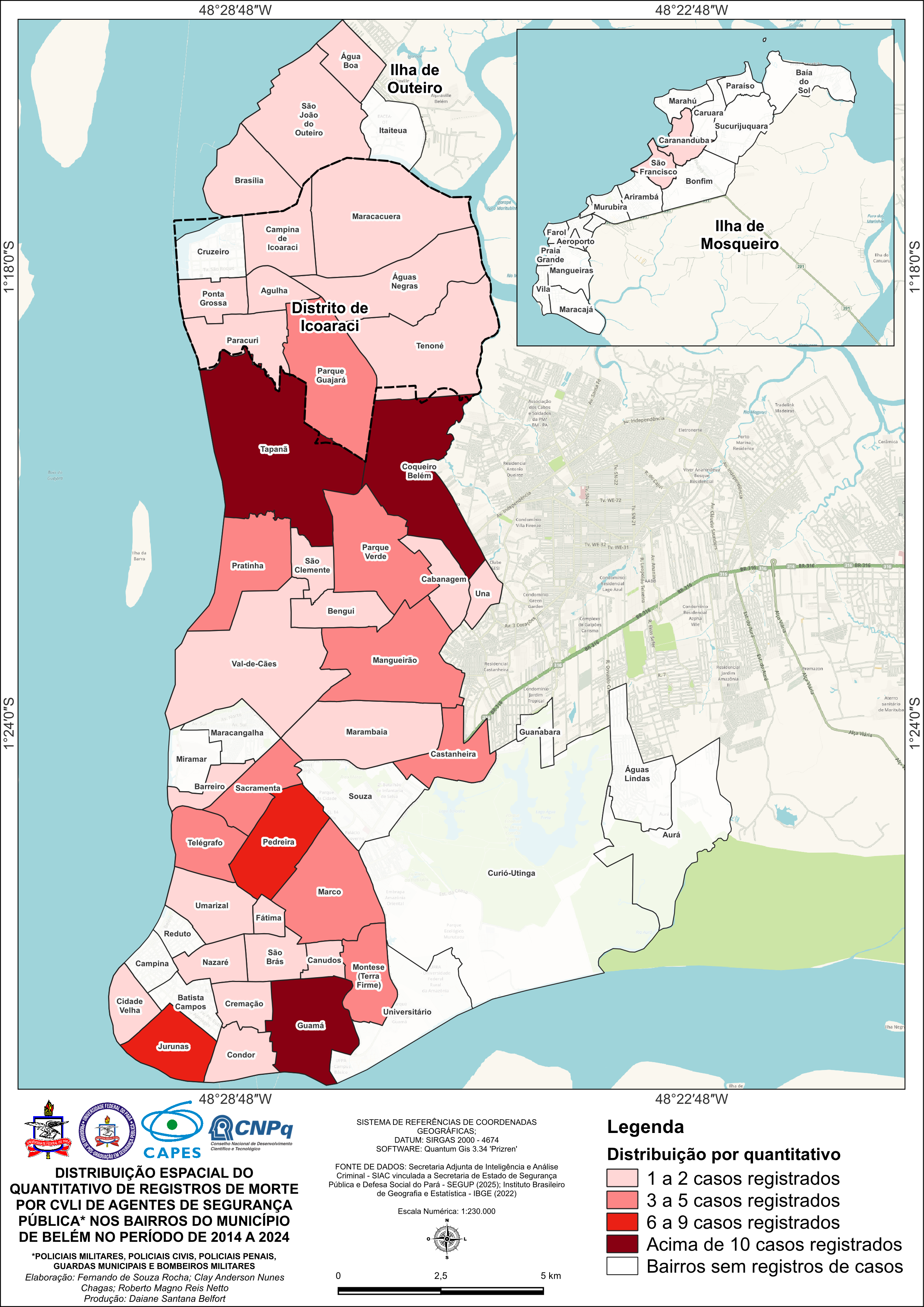 MAPA - Distribuição Espacial do Quantitativo de Registros de Morte por CVLI de Agentes de Segurança Pública nos Bairros do Município de Belém no Período de 2014 a 2024