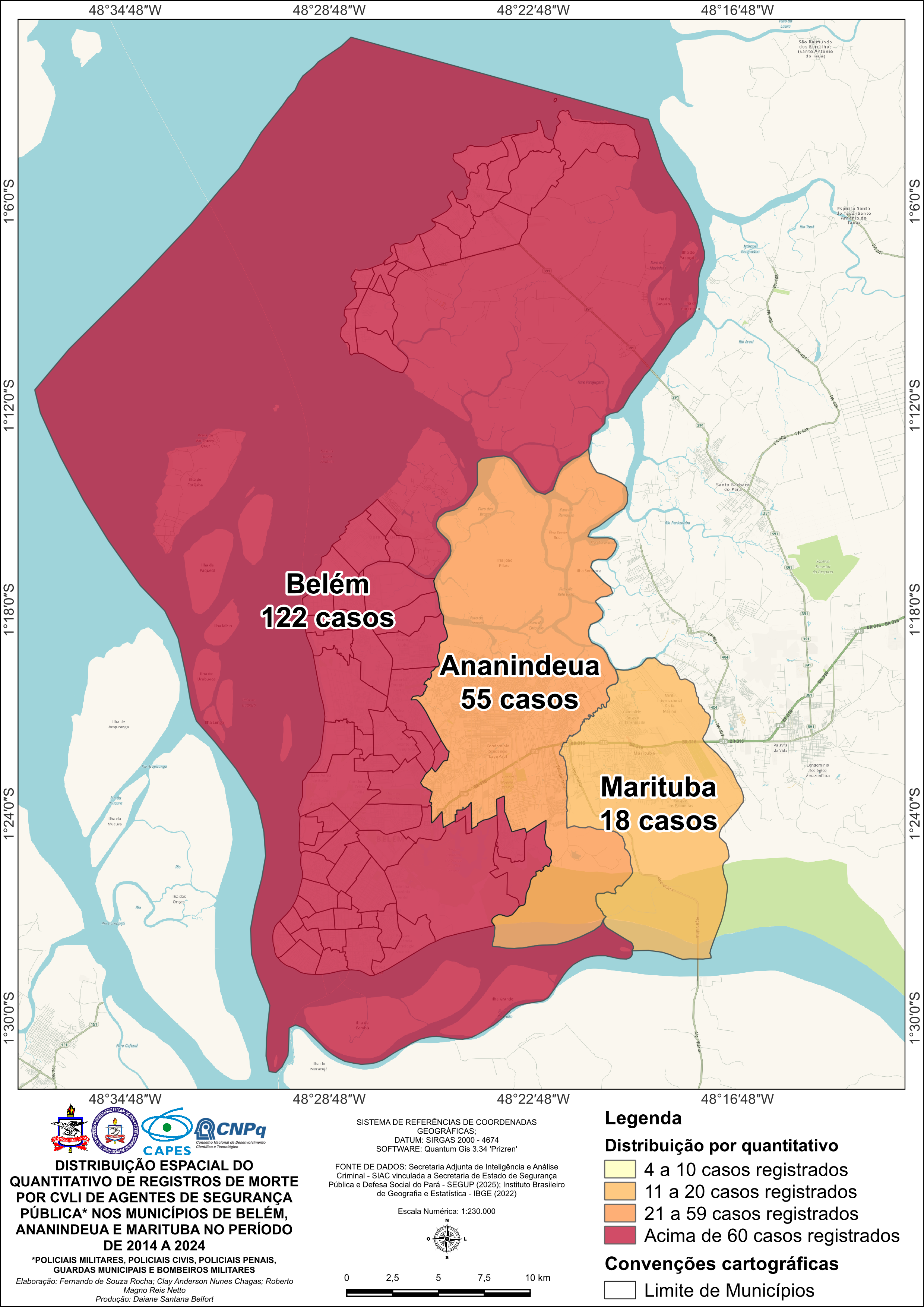 MAPA - Distribuição Espacial do Quantitativo de Registros de Morte por CVLI de Agentes de Segurança Pública nos Municípios de Belém, Ananindeua e Marituba no Período de 2014 a 2024